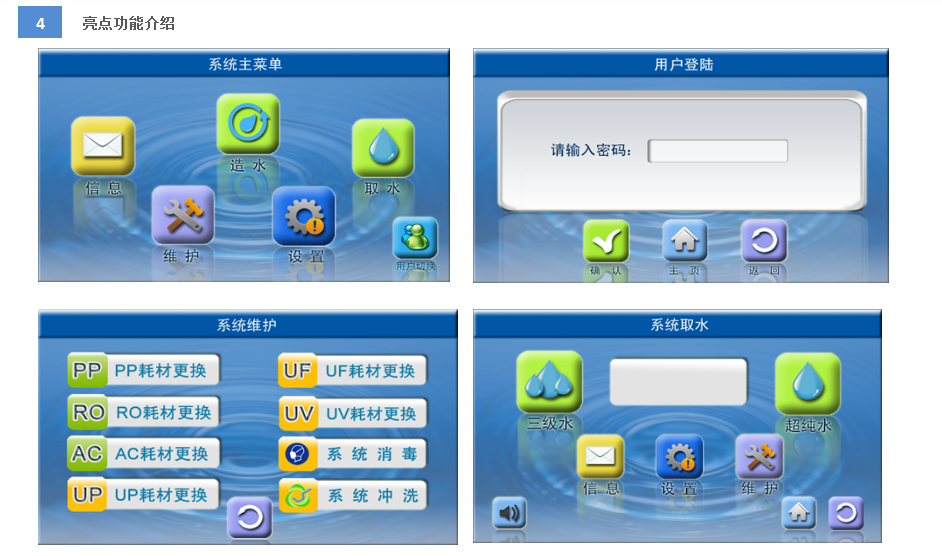 Ø 完善的RO純水和超純水造水、系統(tǒng)取水、系統(tǒng)循環(huán)和消毒等管理功能。