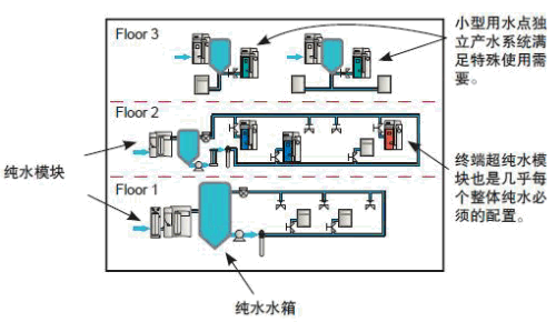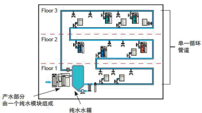 相對于單一循環(huán)的整體純水系統(tǒng),其水質針對性更好、相對消耗更低、管理維護適用性更強、容易滿足不同使用區(qū)域的要求。兼容了集中供水和使用點獨立供水兩種策略的優(yōu)點。